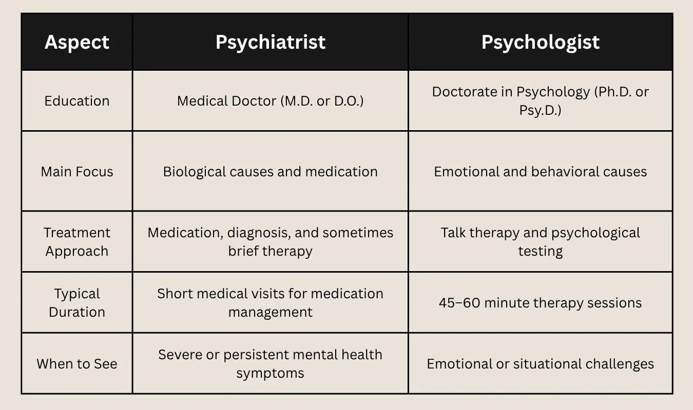 Both psychiatrists and psychologists are trained to support your well-being just in different ways. A psychiatrist helps when medical treatment or medication is needed. A psychologist helps you process emotions, manage behaviors, and create lasting change.