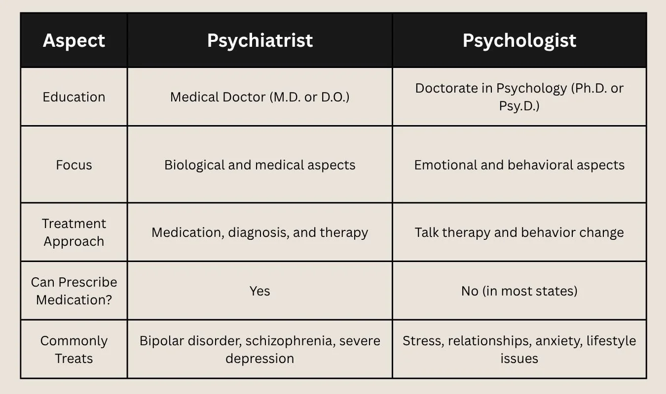 A psychiatrist focuses on the medical side of mental health - diagnosing disorders, prescribing medication, and managing complex symptoms. A psychologist focuses on therapy and emotional healing, helping you understand and manage your feelings and behavior.